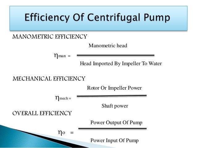 21 01 2019AA Mechanical efficiency of a centrifugal pump I m is the ratio of theoretical power that must be supplied to operate the pump to the actual power delivered to the pump Mechanical efficiency can be used to determine the power loss in bearings and other moving parts of a centrifugal pump